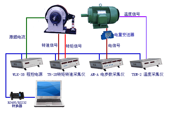 - 系統(tǒng)用1臺磁粉測功機加載,用1臺TR-2B轉矩轉速采集儀采集電機的輸出轉矩和轉速;用1臺AM-A型電參數(shù)采集儀采集電機的輸入電壓、電流、功率因數(shù)、頻率等參數(shù);用1臺TEM-2溫度采集儀采集溫升;用WLK-3B程控電源控制磁粉測功機。